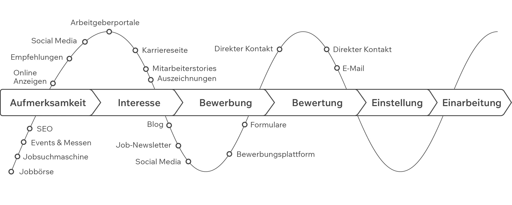 Als Candidate Journey bezeichnet man den Weg, den Kandidaten vom ersten Kontaktpunkt mit einem Unternehmen bis hin zum Abschluss des Bewerbungsverfahrens zurücklegen. Auch Bewerber:innen nutzen oft zahlreiche verschiedene Touchpoints. Unterschiedliche Jobsuch- und Informationskanäle werden dabei (virtuell) besucht.